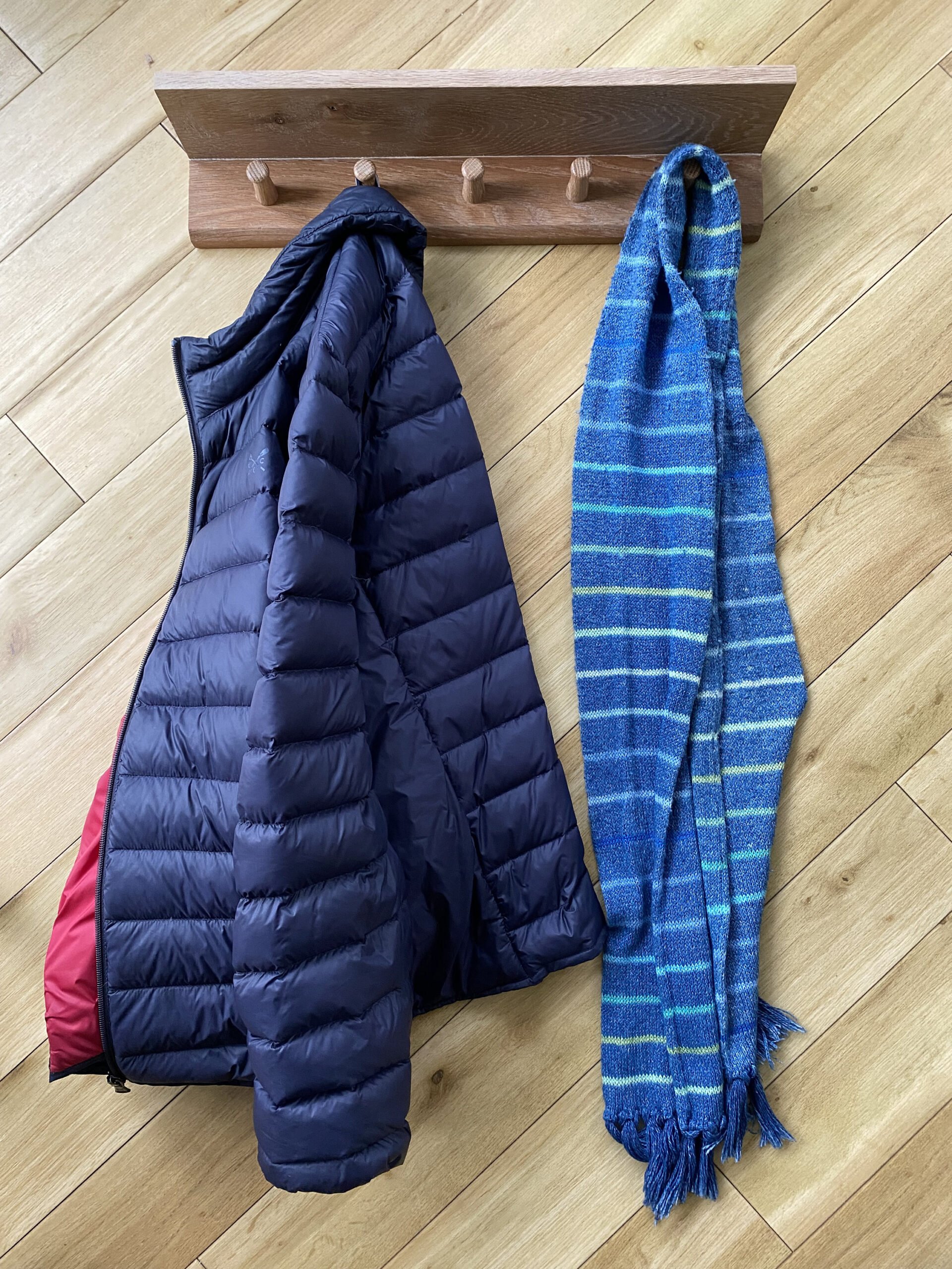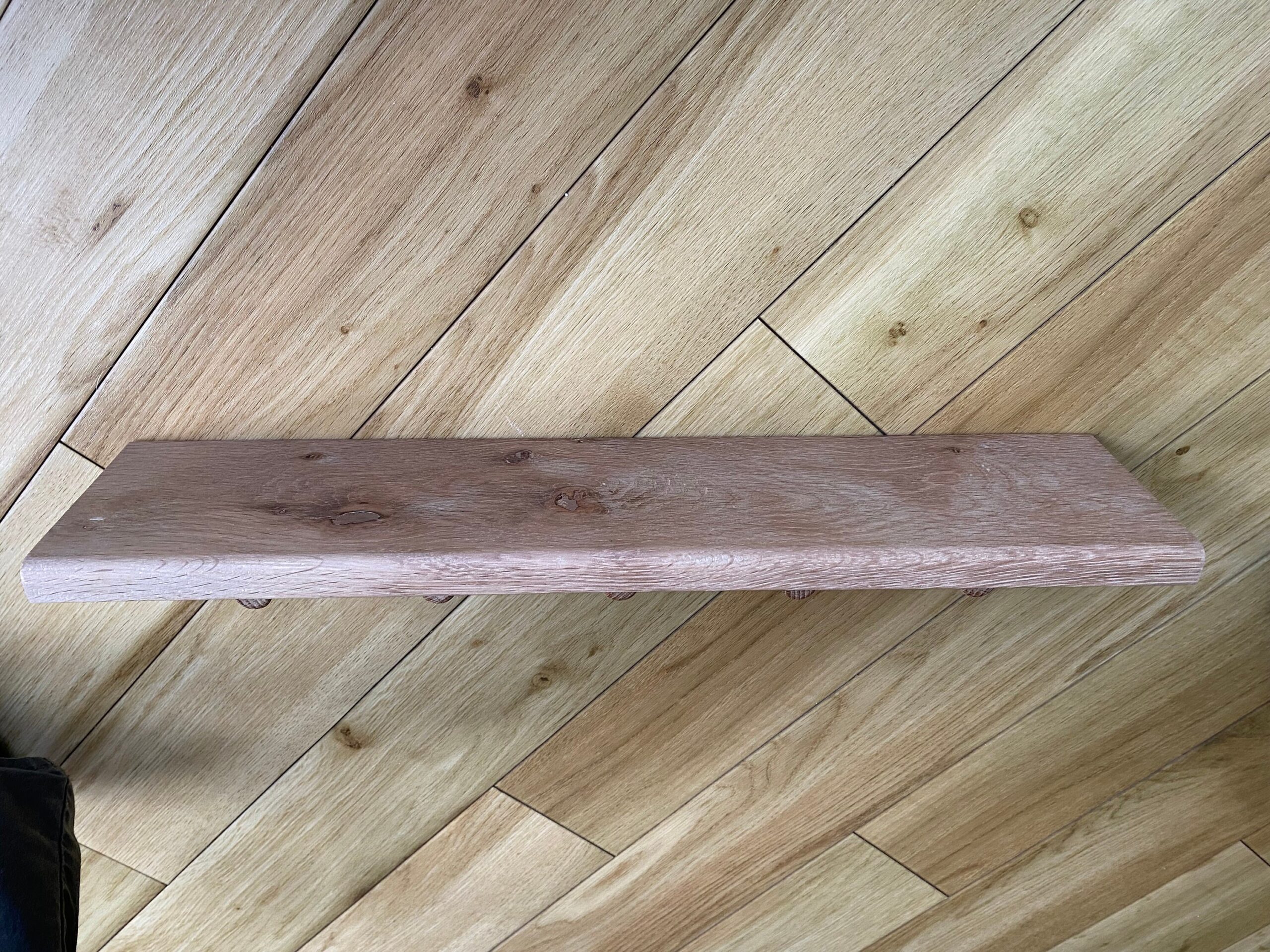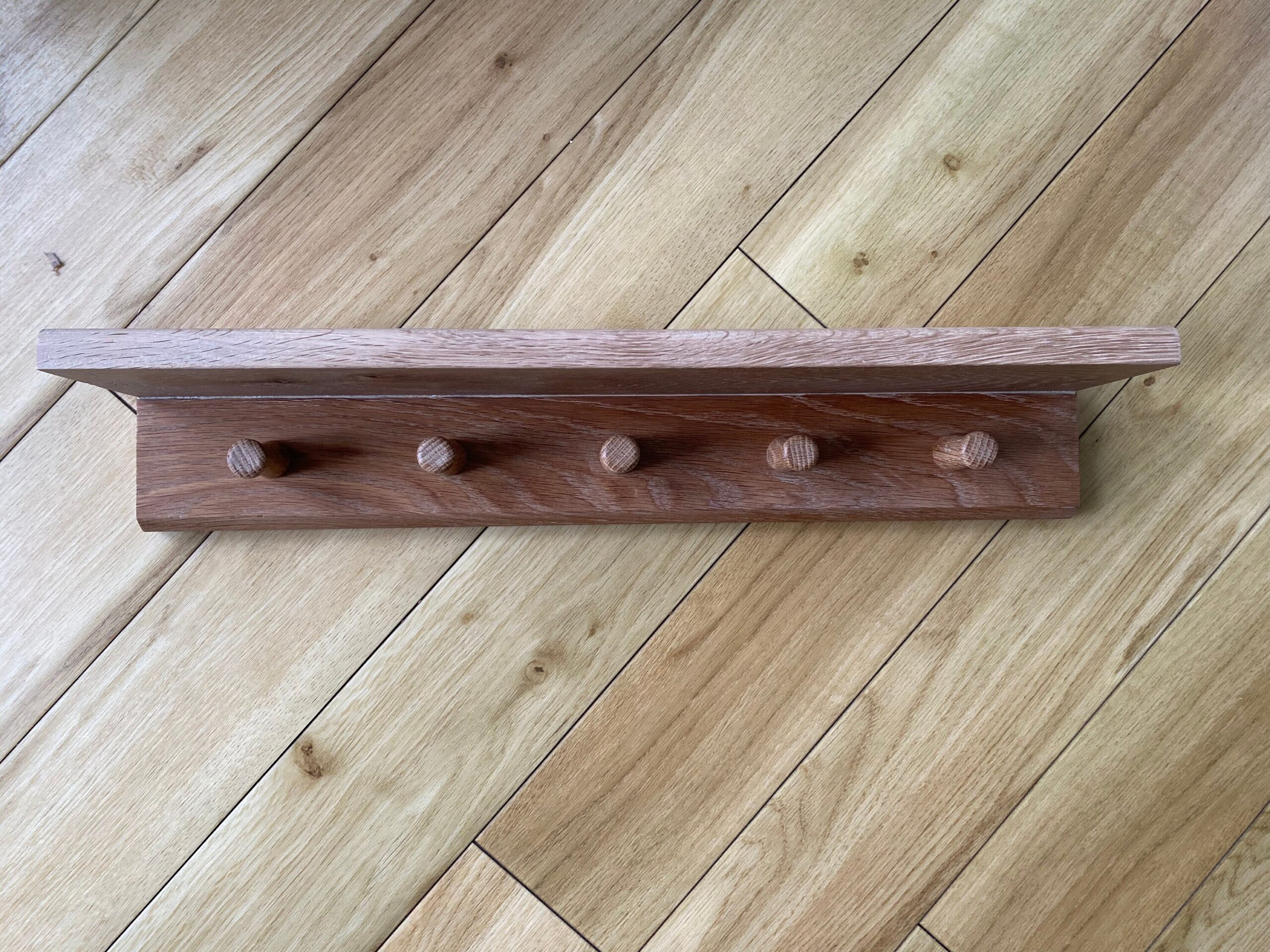 Handmade solid oak coat hanger with integrated shelf and 5 pegs.