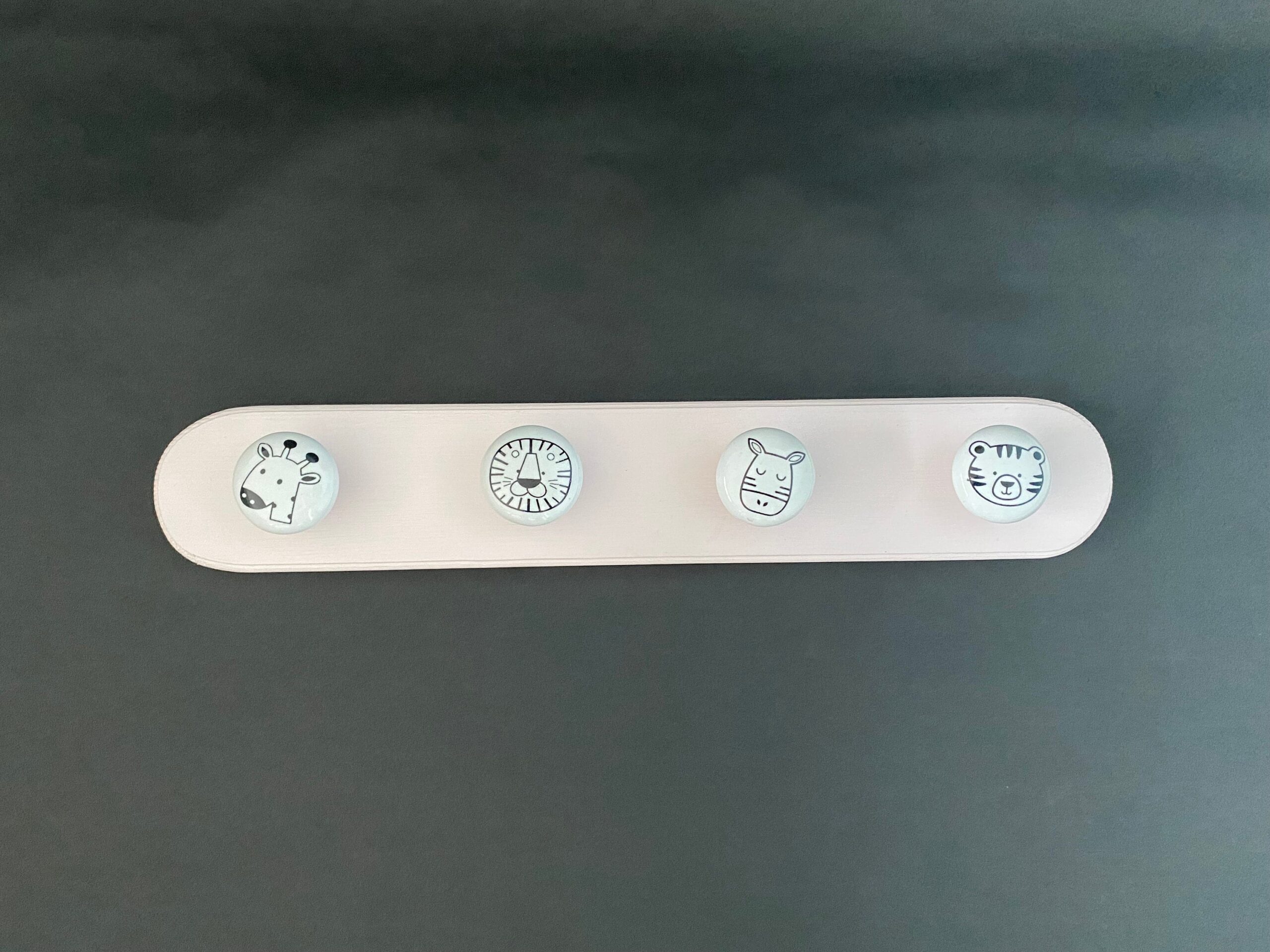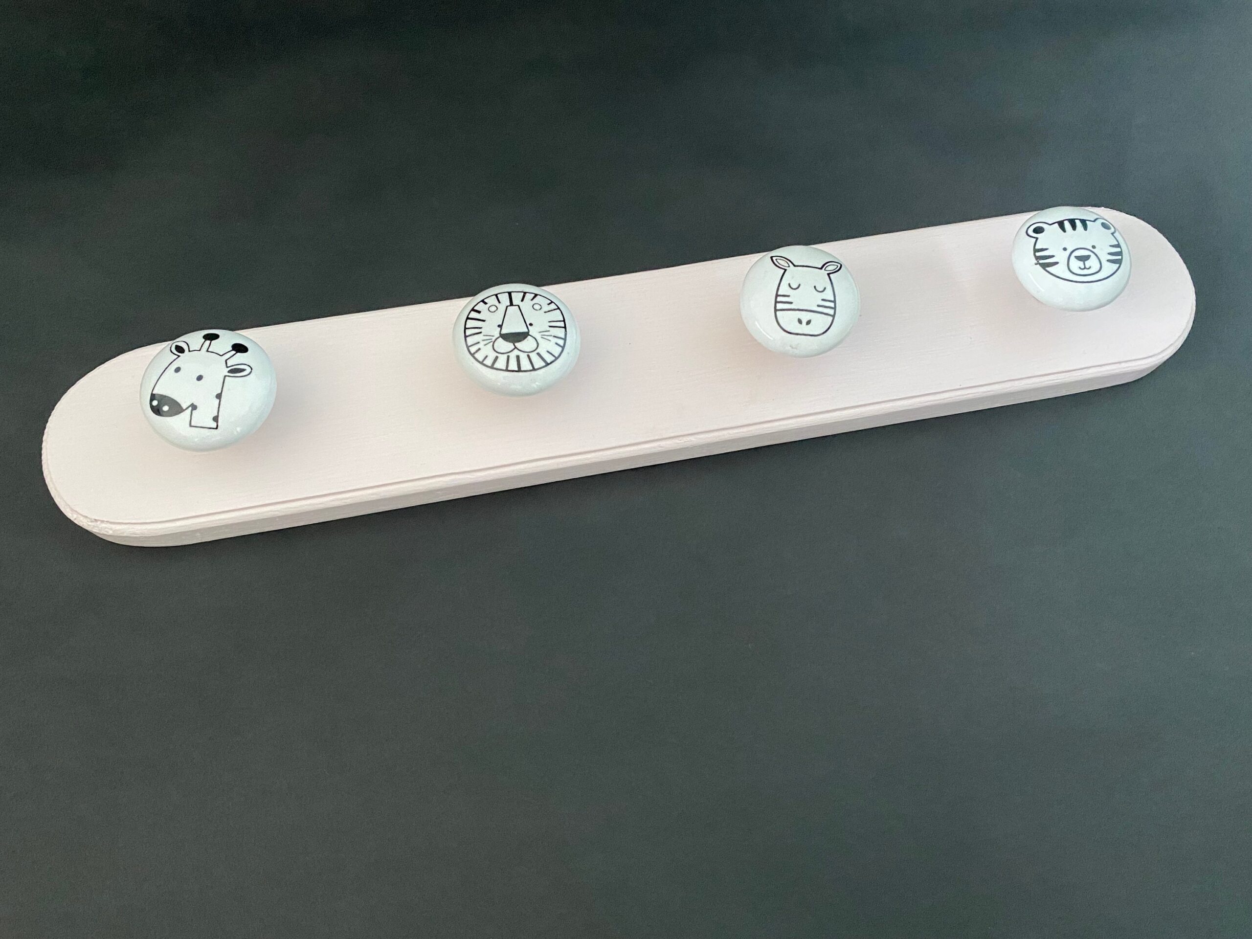 Beautifully hand crafted children's coat pegs. Made from wood and decorative ceramic coat hangers. Finished in either Rustoleum's China Rose or Dusky Pink (not shown) or alteratively in oak with a stylish white wax finish.