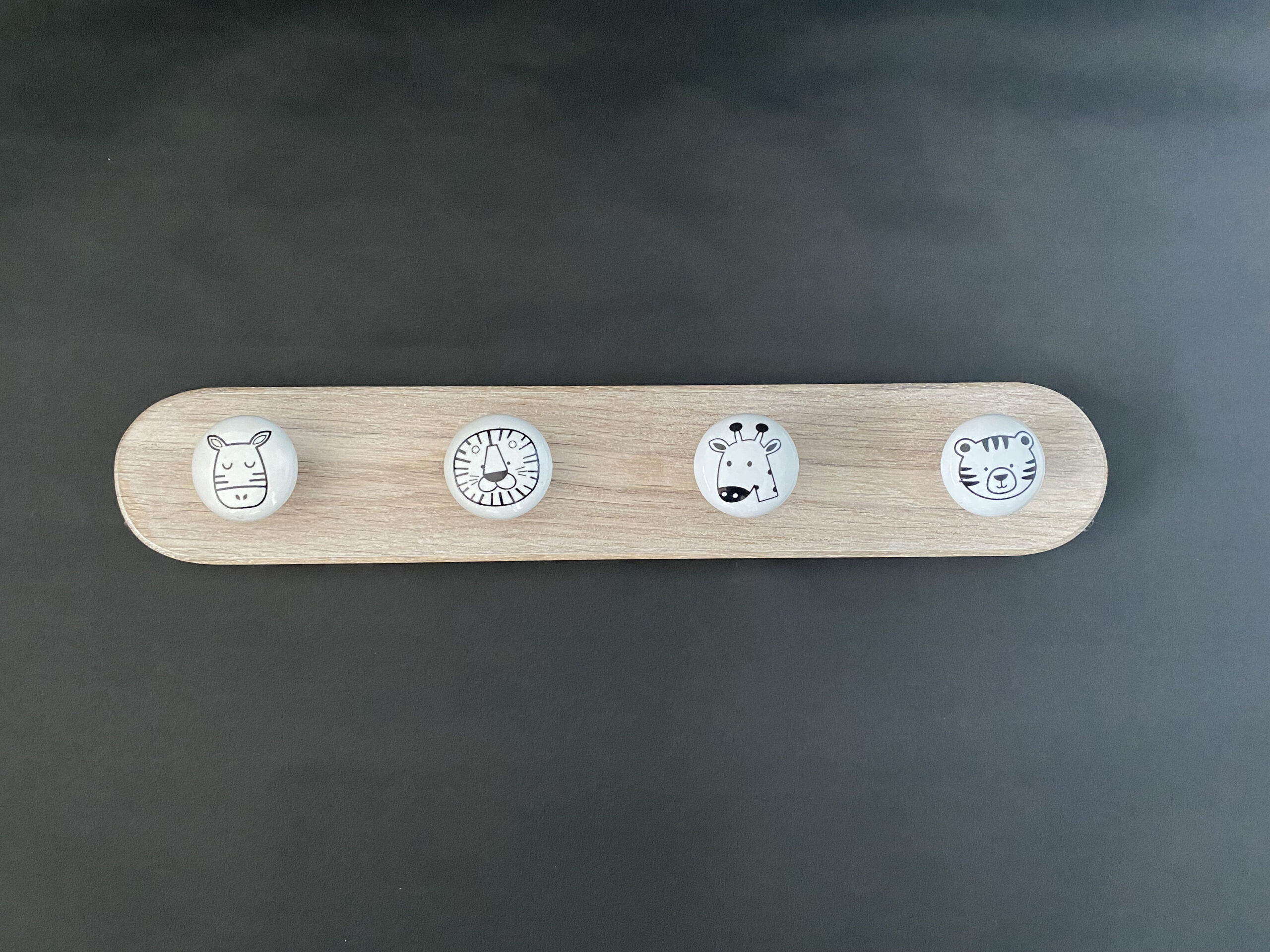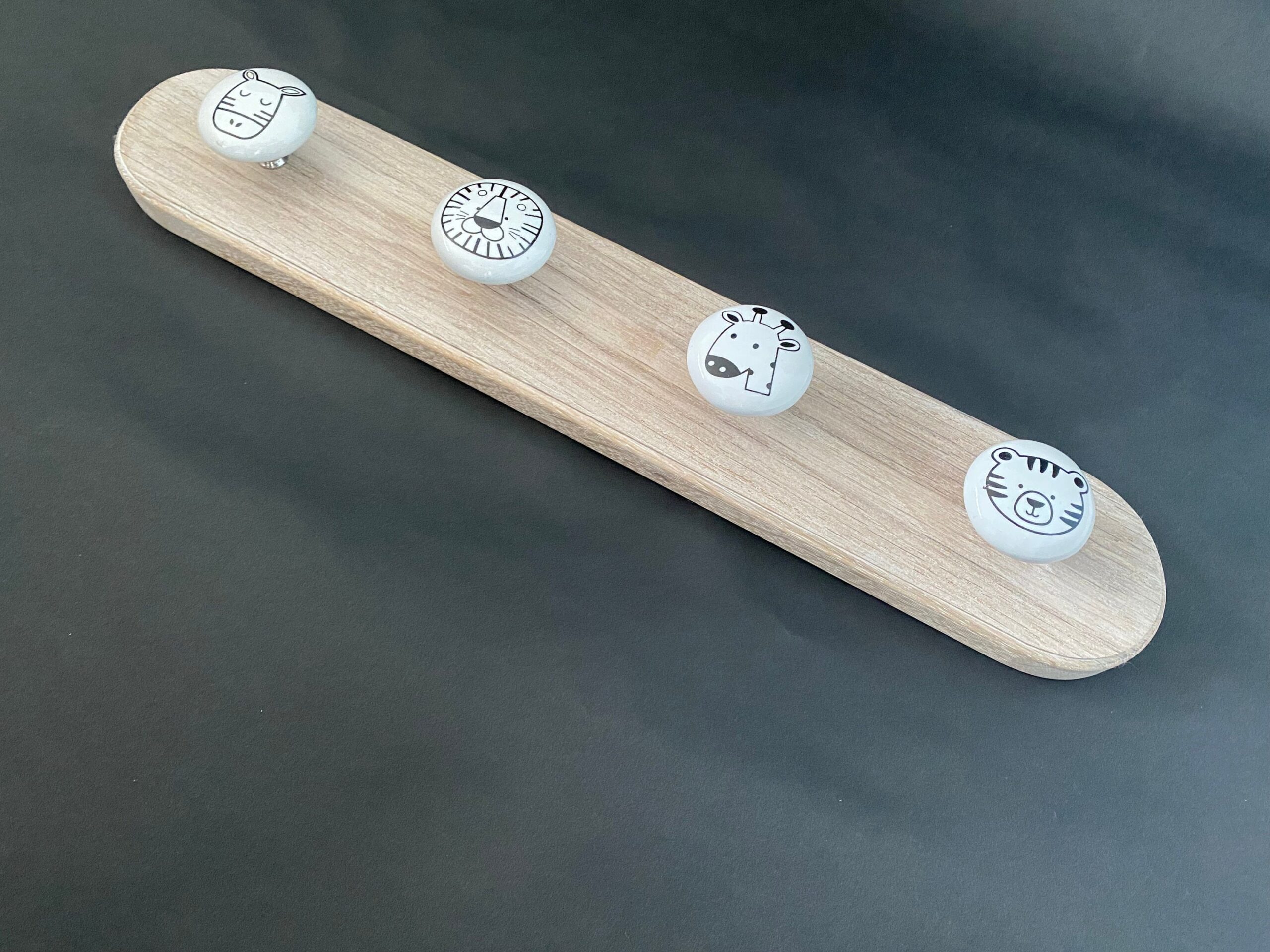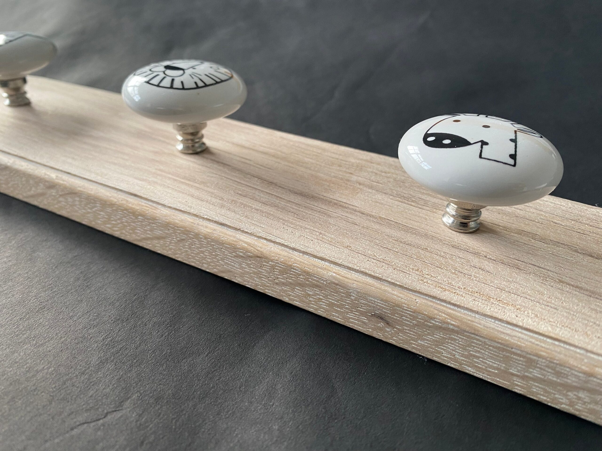 Stylish Children's Wood and Ceramic Coat Hooks finished in either pink or waxed oak. Handmade in UK