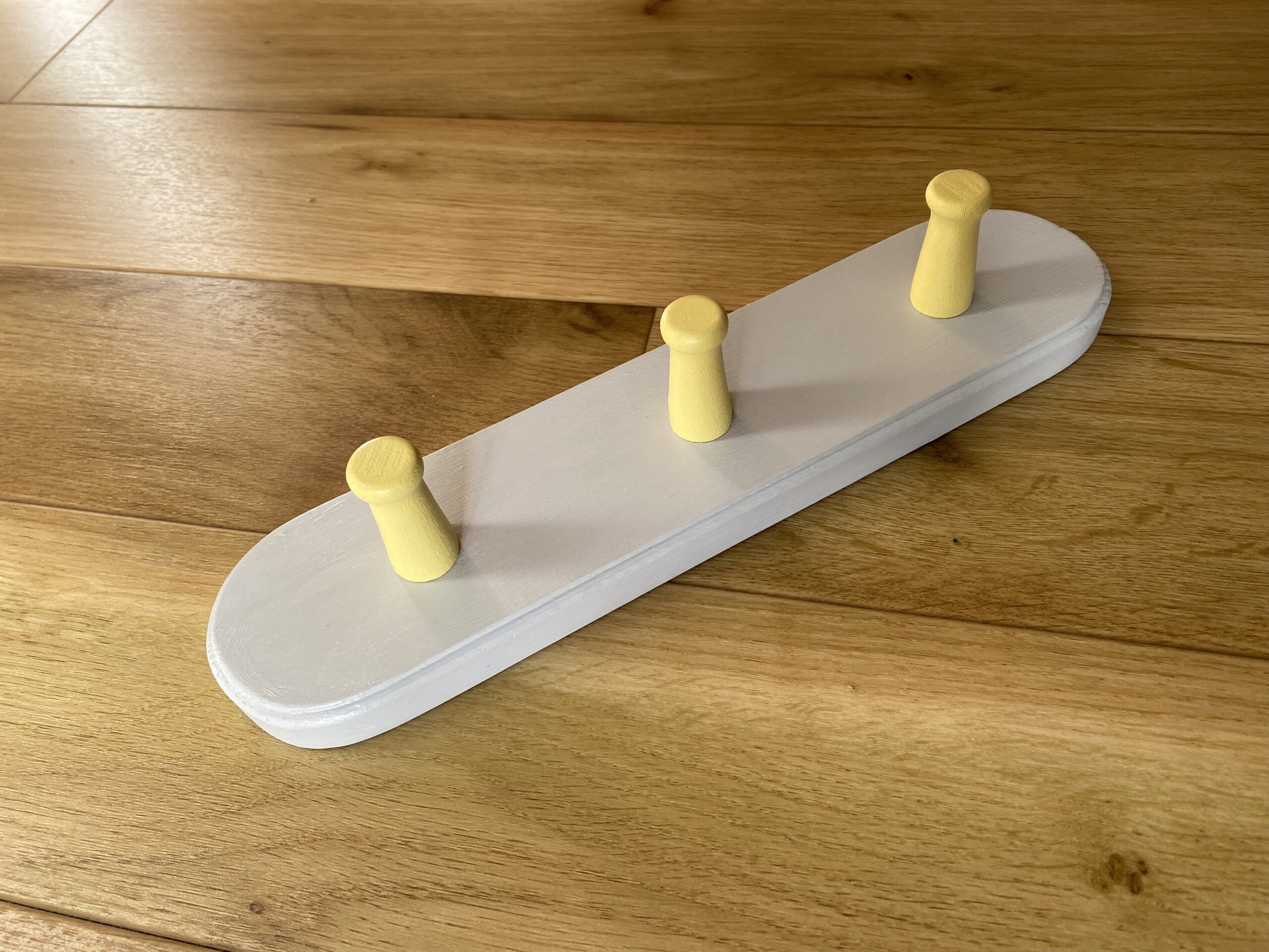 Beautiful hand made wooden two tone coat hooks. Finished winter grey with yellow pegs. Ideal for a children's room. Available with different number of pegs