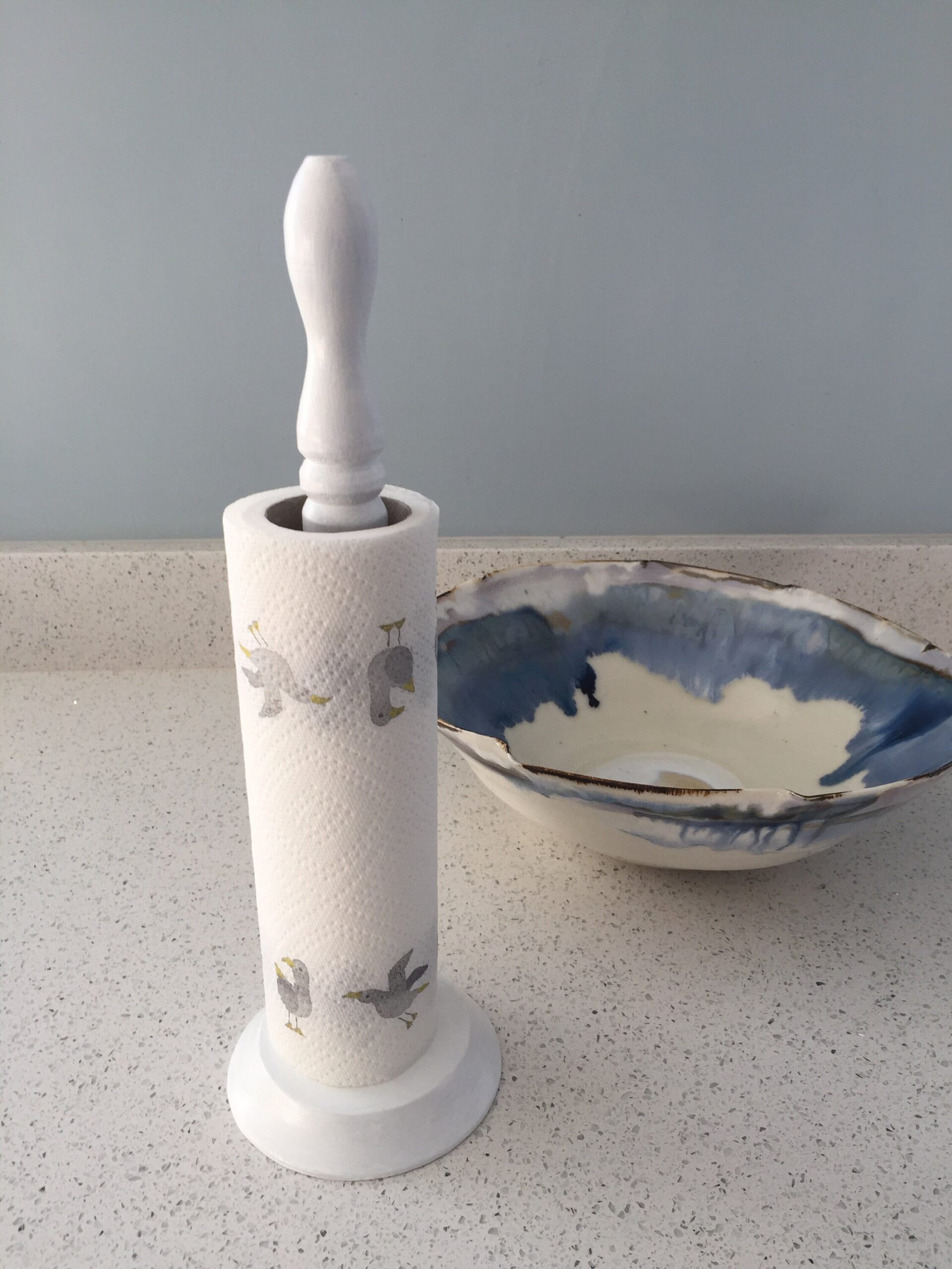 Beautifully hand crafted wooden kitchen roll holder finished in satin white Height 35 cm Base diameter 10.5 cm